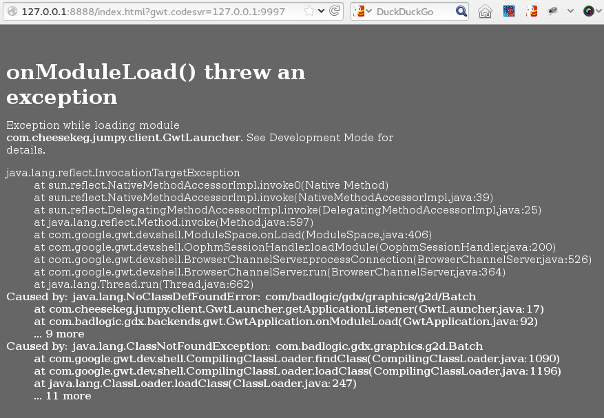 The root cause is the last “Caused by” line, so here it’s “java.lang.ClassNotFoundException: com.badlogic.gdx.graphics.g2d.Batch”. It looks like someone didn’t setup the class path for this Java app correctly and hence the developer needs to add the missing class to it.