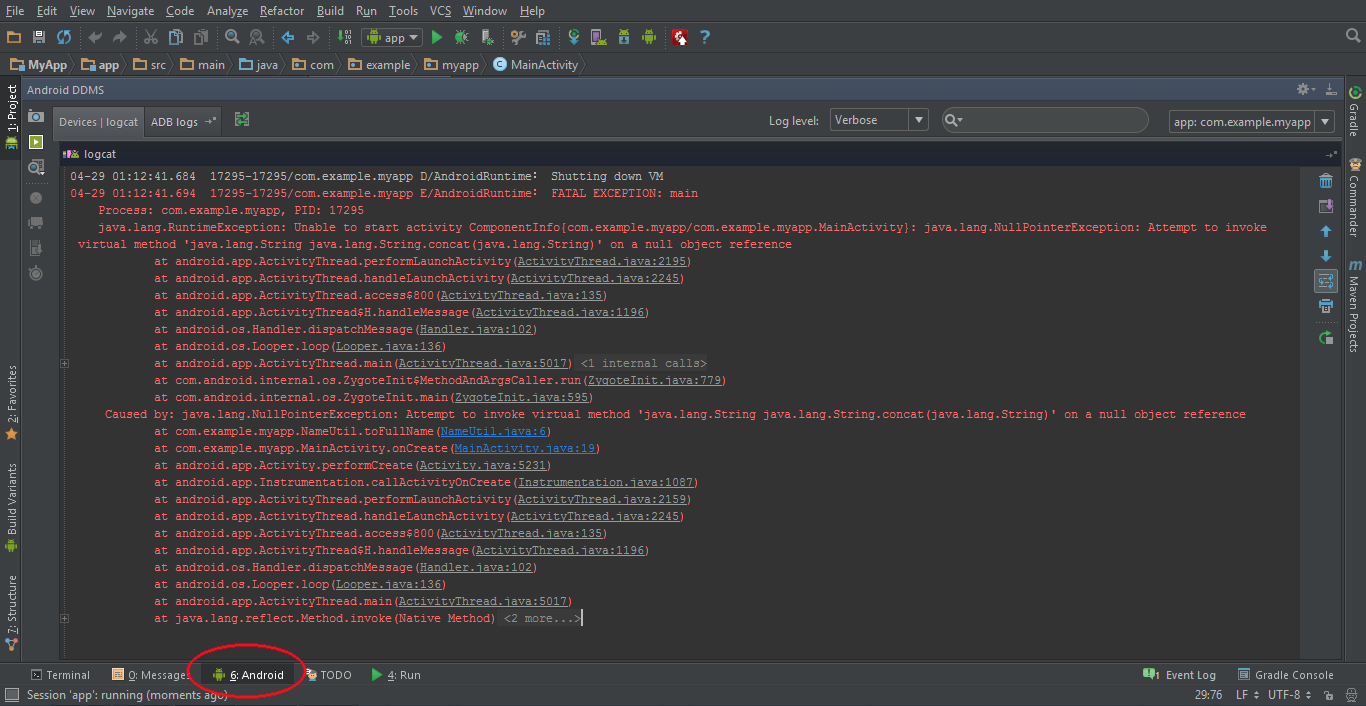 It sucks to say it, but 99% of time the stack trace will come from a bad assumption in your OWN code. So, in the above screenshot, someone did something wrong in com.example.myapp.NameUtil.toFullName (line 6 in fact!). Now it may not be that exact line which has the bug, but you’ll need to work backwards up through the code to find where a bad argument was perhaps passed in. Which brings me to the next piece of advice: