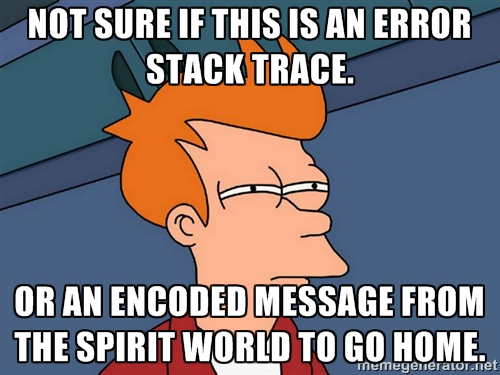Not every bug will have a stack trace, but most of them do. The ability to read and understand them in seconds is an incredible skill. The key to remember is that the root cause, the filthy culprit that broke your perfect day, is usually wrapped up several layers deep. So work from the bottom of the scary long stack trace upwards to find the root cause!