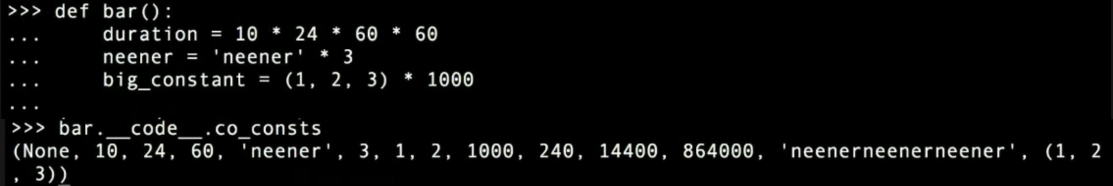 In the example above, “duration” and “neener” have both been expanded into the result, so Python will load 864,000 every time “duration” is referred to and Python will load neenerneenerneener for the expression “neener”. However, big_constant’s tuple has not been expanded because the peephole optimizer is being smart about space. A tuple of 3000 elements will make a bytecode file unusually large, which is why a sequence can be multiplied by at most 20 times. Thus, the peephole optimization has limits, as strings often exceed 20 characters. Nonetheless, the peephole optimization is still quite useful in saving programmers from having to worry about all the constants they may use.