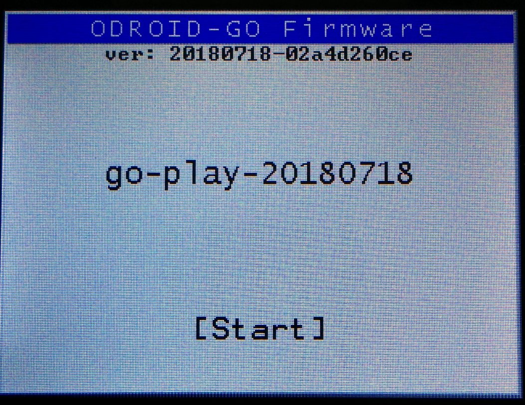 The Odroid Go comes with firmware version 20180627 of the box. The initial versions of the firmware were released as a single downloadable file that when executed would flash the bootloader and emulators. The newer format splits the code into the following units: