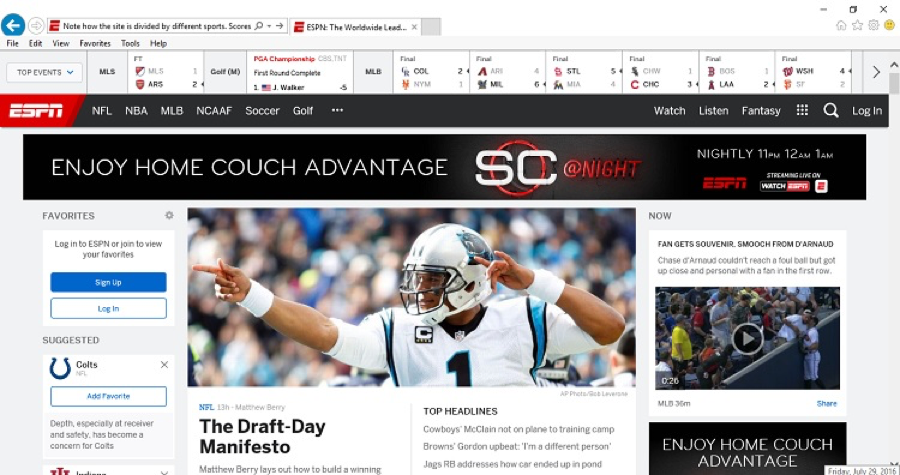 Using the example of ESPN, the site is very user friendly. Note how the site is divided by different sports. Scores are listed across the top of the page for a quick update at a glance for site visitors. Then, popular stories are listed still above the fold.