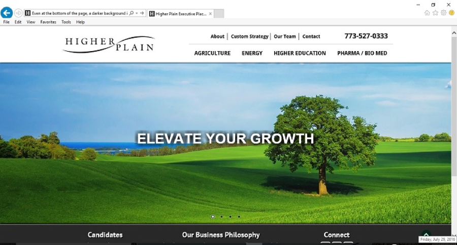 Even at the bottom of the page, a darker background is used to create natural white space around categories such as “Candidates” and “Our Business Philosophy.” You’ll also find social media buttons to allow you to connect with the company through several different social media platforms.